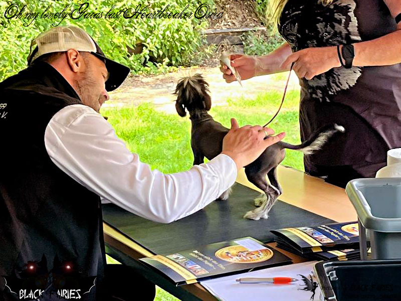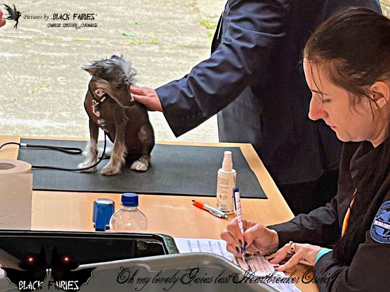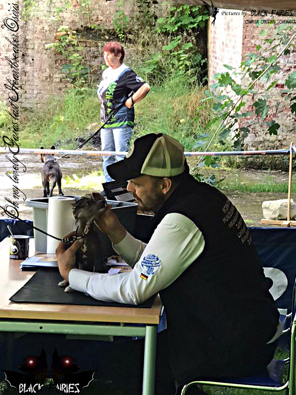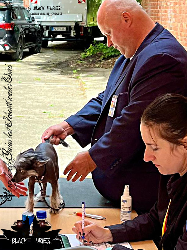 Stellt Euch mal vor, was wir tolles gemacht haben. Wir waren auf einer Hundeausstellung, das ist etwas ganz besonderes. Da darf ich den ganzen Tag stolzieren, Mutti anhimmeln und viele andere Hunde und Menschen sehen. Ich erzähl euch mal, was da so passiert. Zuerst hat mich ein Mann abgetastet und ganz genau geschaut, ob alles an mir dran ist. Hier seht ihr ihn, er war sehr nett, aber auch sehr streng. Ich habe ihn nicht verstanden, denn er sprach in einer anderen Sprache. Mama sagt, das war Polnisch. Dann durfte ich zu einem anderen Mann auf den Tisch, der hatte eine Käppi auf. Aber das war mir wurscht, ich hab ihm trotzdem ein Küsschen gegeben. Auch er hat geschaut, ob alles an mir dran ist und wie meine Zähne sind. Ich glaube auch ihm habe ich gefallen. Der Tisch ist toll da gibt’s immer fein Leberwurst, ich freu mich schon aufs nächste Mal. Und dann durfte ich mit Mama im Ring laufen. Das macht mir so Spaß, da fliege ich neben meiner Mama her, werf die Beine und kann mich toll präsentieren. Mama war dann sehr stolz auf mich. Danach war ich sehr müde, aber sehr glücklich. Bis bald mal wieder euer Osiris